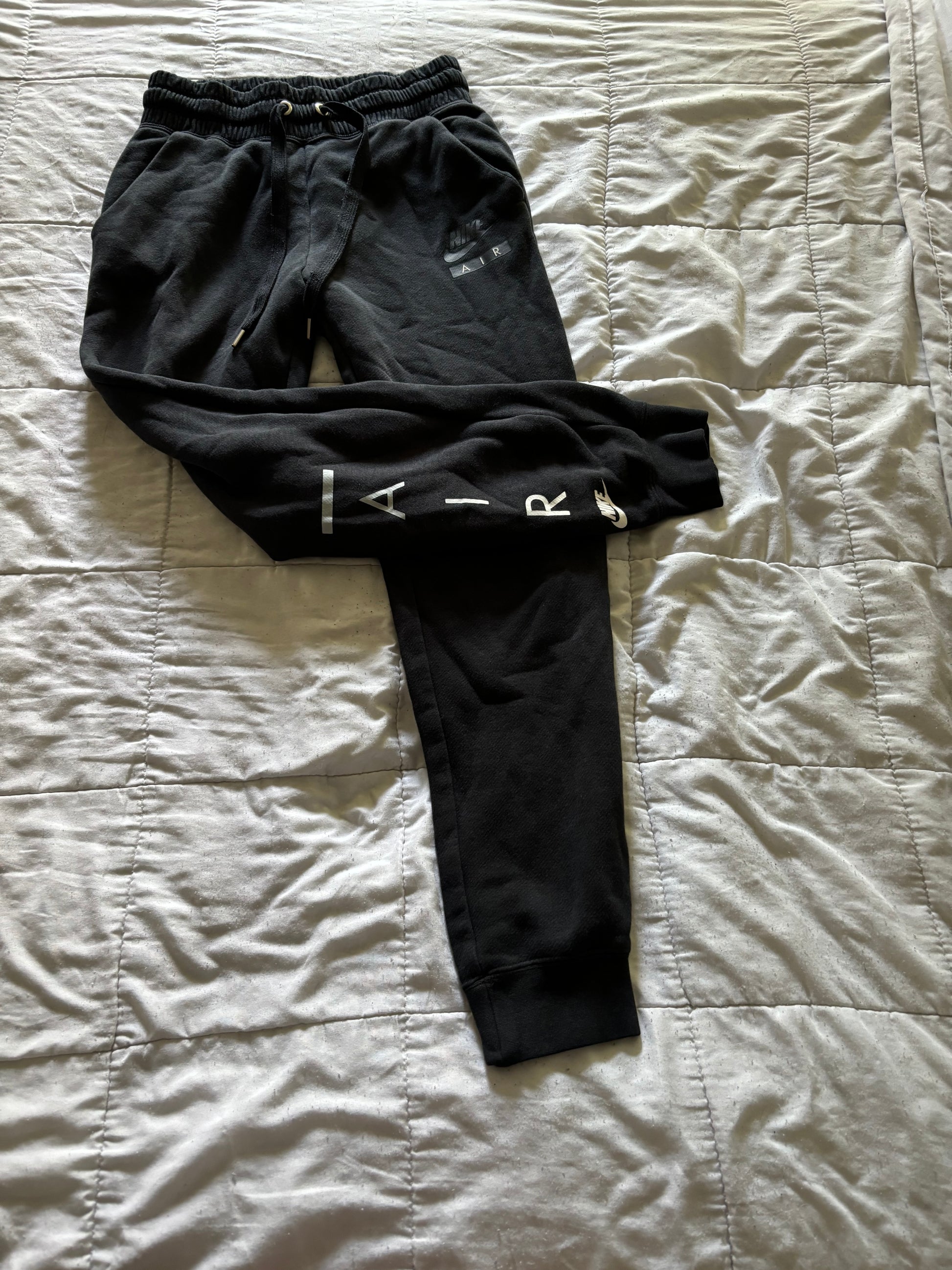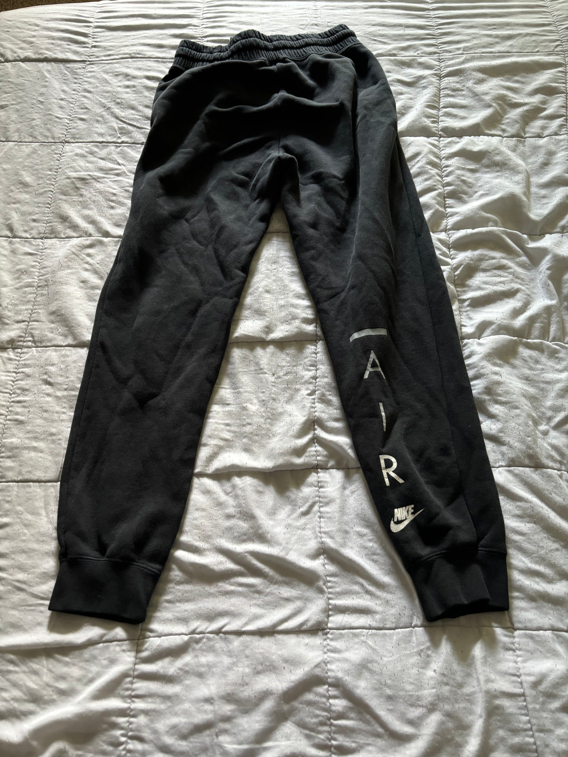 Women’s small black Air Nike joggers. Very comfortable. I just like my sweats to fit a little bigger. Will come washed, ironed and ready to wear.